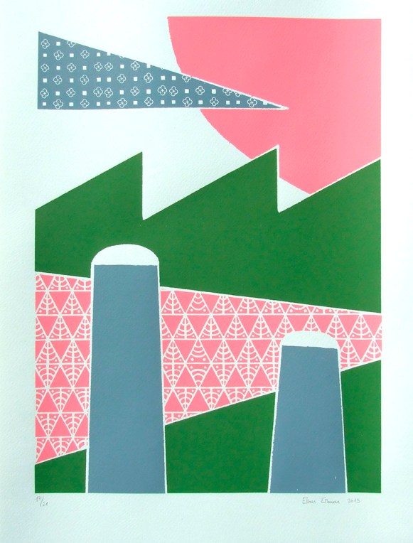 Industrial Landscapes Serigrafías en tres colores con tramas handmade. 27 copias. 32×53 cm. 2015 Silkscreens in 3 colours with handmade patterns.27 copies. 32×53 cm. 2015
