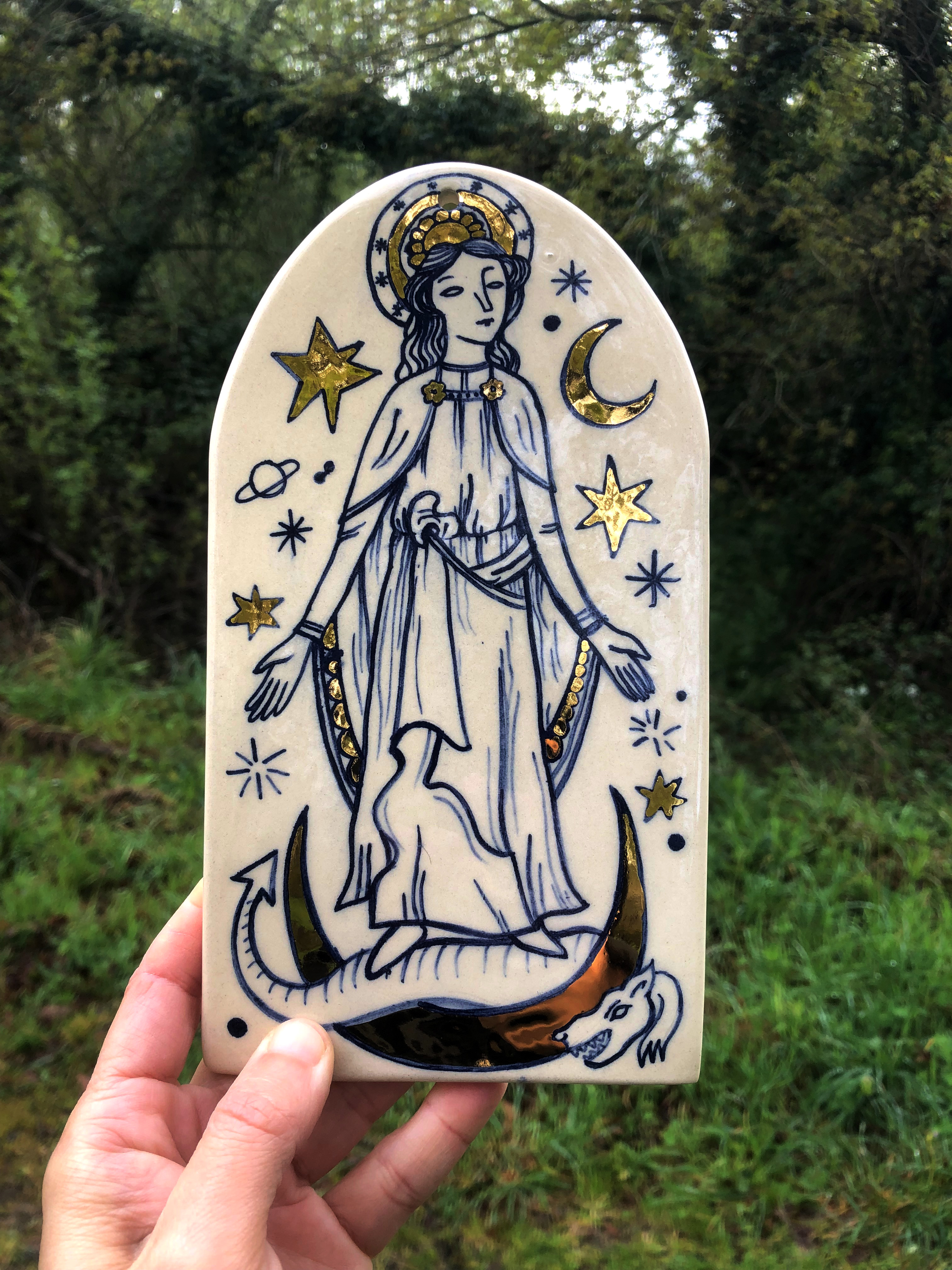 He investigado su iconografía desde los tiempos medievales y cómo fue su asimilación en el territorio de Galicia y de esta investigación salió, por un lado, una serie de piezas realizadas a mano en cerámica para mi proyecto LiMiA y, por otro lado, un video divulgativo explicando la figura de esta santa tan venerada, aún a día de hoy, en Galicia.