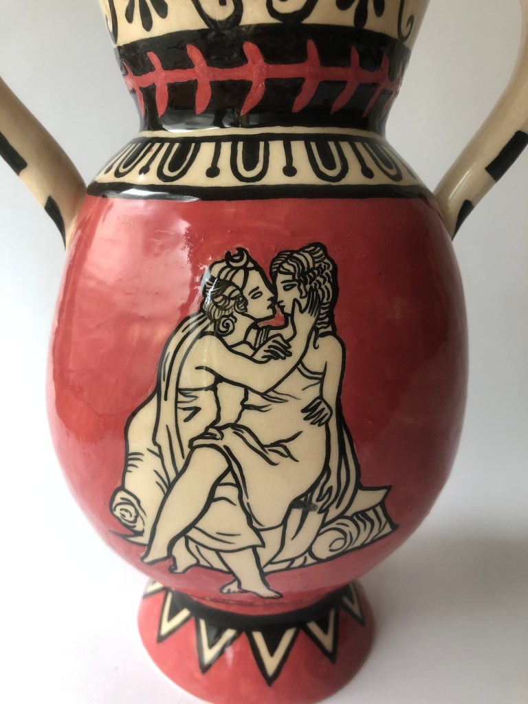 These vases are part of a series entitled Sapphic Vases, which draws inspiration from ancient illustrated Greek amphorae and vases.